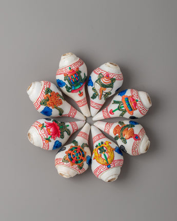 8 Auspicious Symbols Conch Shell Set with Wooden Stand - Ritual Decor