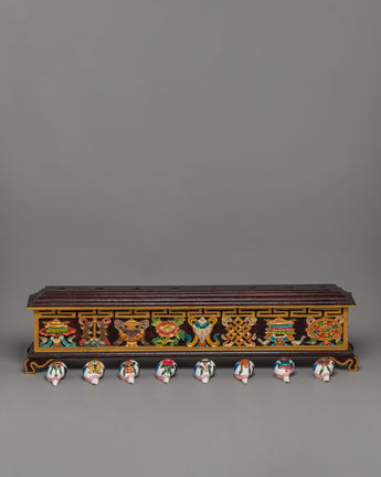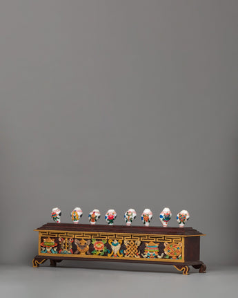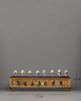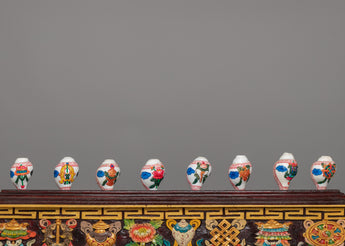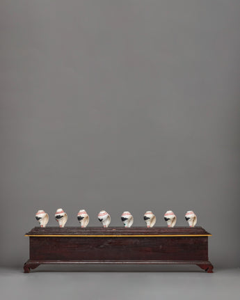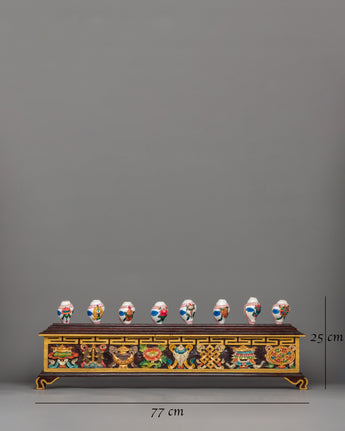 This exquisite set of eight auspicious symbols conch shells with a wooden stand is displayed on a beautifully crafted natural foundation. The combination, which measures 25 cm in height and 77 cm in width, makes an attractive centerpiece for altars or areas used for meditation. Bright representations of sacred meanings, such as the Dharma Wheel, Lotus, and Endless Knot, which stand for blessings, harmony, and spiritual enlightenment, are painted on each conch shell.