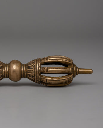 Vajra is a Sanskrit word meaning both thunderbolt and diamond. It is a weapon used as a ritual object to symbolize the properties of a diamond (indestructibility) and a thunderbolt (irresistible force). The five-pronged vajra is the most commonly seen vajra.