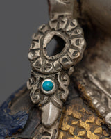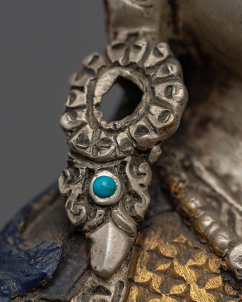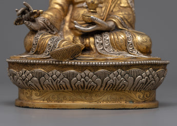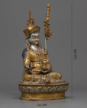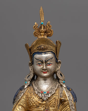 This 9.4" antique finish Guru Rinpoche statue is a one-of-a-kind depiction of the Tantric Buddhist Master. It is an excellent addition to any Buddhist collection, with silver plating coated in golden details and lifelike characteristics.