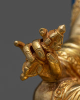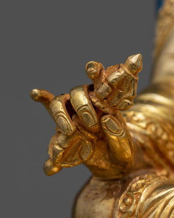 Handmade in Nepal by a group of Nepali artists, He is depicted sitting atop of moon disc of a lotus, holding the vajra scepter in his right hand, left hand placed in the lap holds a white skullcup filled with nectar, jewels, and a long-life vase. The ornate katvanga staff rests against the left shoulder. Adorned with earrings and necklaces, the head is covered with a lotus hat, a gift of the King of Zaho.