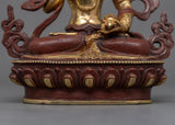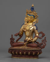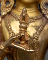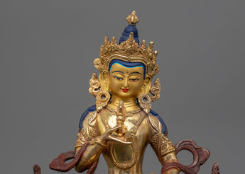 Handmade in Nepal by skilled artists, the statue is made of a copper body and gilde in genuine 24k Gold. The deity is holding an upright vajra in his right hand and a bell in his left hand. He is depicted sitting atop a moon disc of lotus seat with a smile on his face.