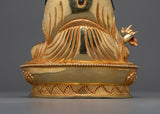 A Fully Awakened One Guru Rinpoche Statue is a Nepalese craftsmanship, made of copper and gilded in 24K gold. The gold and acrylic paintings bring out the fine features of his serene demeanor, flowing robes, and regal lotus throne. Guru Rinpoche is represented seated, holding a vajra in one hand and a skull cup in the other, with his staff resting against his shoulder, representing his mastery of spiritual strength and protection.