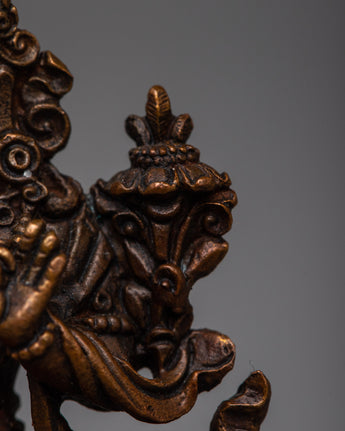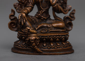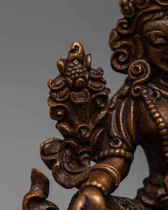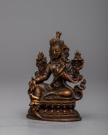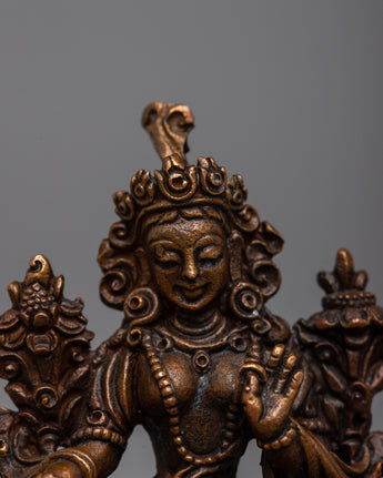 Presenting our Green Tara Statue, which is carefully made on oxidized copper with machine. This statue captures the heavenly spirit of Tara, the embodiment of compassion and enlightenment, and stands a modest 6 cm tall and 4 cm wide. It is small in size, but it has great meaning—it represents Tara's unwavering support and direction. This statue exudes Green Tara's caring energy, which can be used to decorate your own altar or act as a focal point during meditation. It provides comfort and protection for your spiritual journey.