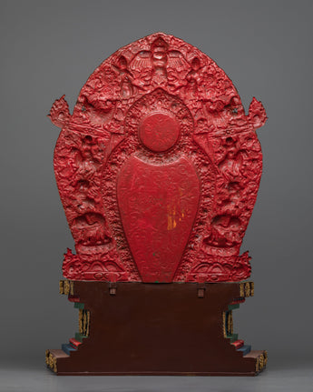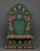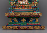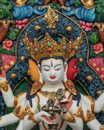 The copper body of this Namgyalma Buddha Statue, which was masterfully hand-carved in Nepal using the classic Himalayan technique, was gilded with genuine 24K gold. A calm face, a semi-wrathful expression, and a wrathful face are all shown on the statue. Namgyalma is in the meditation position while sitting on a lotus disc and has eight arms. She carries different sacred objects in each of her arms. The use of acrylic paints further highlights the three faces of the deity and throne set. Acrylics were used to paint the deity's physical form. The beautiful designs are all hand-carved. The elaborate design patterns were hand-carved using a hammer and tiny chisels. Artists must have years of skill since delicate carvings require them to carve out elaborate designs on a small surface. We guarantee that the statue's materials are of the most outstanding quality and will survive very long. The figurine weighs about 10.15 kg, and it took us years to devotion to complete it with attention to every minute detail.