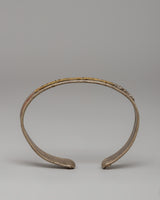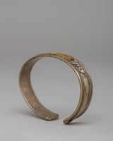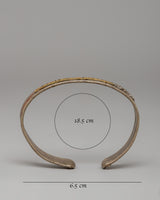 This Tibetan Adjustable Charm Bracelet will add spirituality and workmanship to your outfit. This bracelet is expertly crafted from white metal and includes the matra phrase, a timeless emblem of compassion and enlightenment. The gold-tone text is softly embossed, contrasting well with the elaborate vajra engravings in the bracelet. It measures 1.2 cm in height, 6.5 cm in breadth, and 18.5 cm in diameter, making it a comfortable unisex adornment that exudes good energy and spiritual elegance.