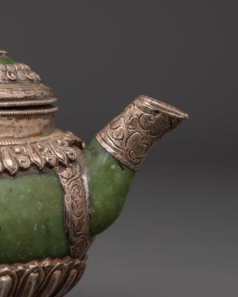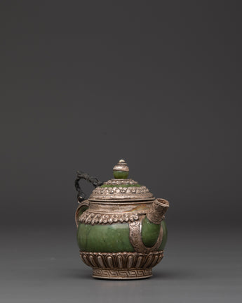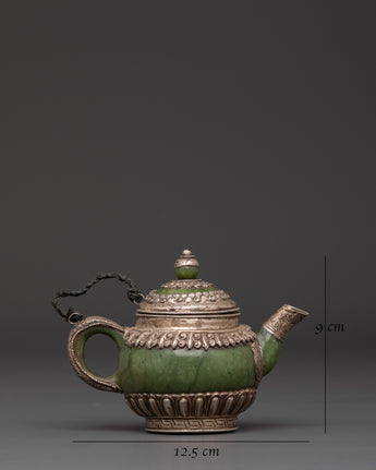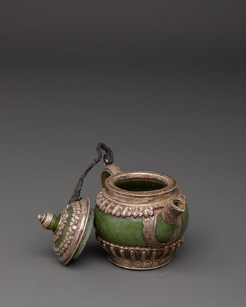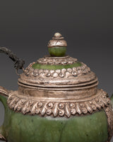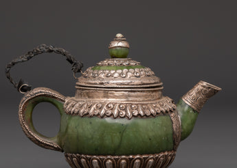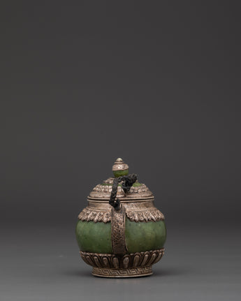 Made from 92.5% pure silver, this ritual teapot reflects craftsmanship rooted in Himalayan tradition. The inclusion of jade adds a touch of elegance and spiritual symbolism, often associated with longevity and protection. Lightweight yet at 0.23 kg, it’s perfect for meditation spaces, home altars, or as a unique gift for spiritual seekers. A true collector's item that embodies devotion and artisanal excellence.