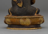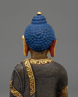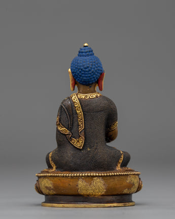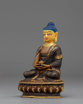 Amitabha is shown in a tranquil sitting stance, holding a begging bowl in his lap to symbolize renunciation and the simplicity of the enlightened life. His peaceful countenance represents the knowledge and compassion he bestows on individuals seeking rebirth in his Pure Land, Sukhavati. This statue, with its gold highlights and oxidized copper details, is a profound spiritual item suitable for devotional practice, meditation, or contemplation of Amitabha's teachings on unlimited light and boundless compassion.