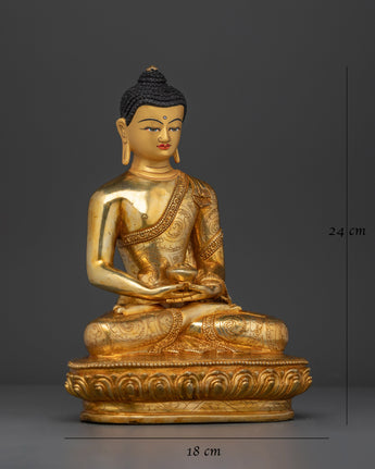 The Amitabha Buddha Buddhist Enlightened Teacher Statue is 24 cm tall, made with great attention to detail from high-quality copper, and embellished with gold electroplated. This statue is the ideal accent to any area used for meditation or other spiritual activities since it personifies the calm and caring nature of Amitabha Buddha. The deity's gentle features and famous meditation pose are accentuated by the intricate carvings and bright gold finish, signifying his role as the enlightened teacher of endless light and compassion.