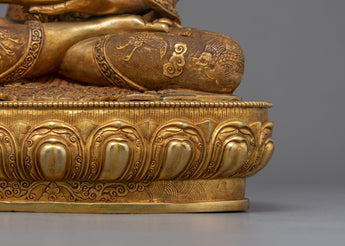 We hand-carved Buddhist Infinite light deity of Amitabha Buddha Figurine in traditional Himalayan Art of Nepal. We have been sculpting sacred Buddhist deities for generations, giving the statue an antique touch to his intricately carved design robe. We have depicted him sitting on the moon disc of lotus, holding an eternal life nectar vase with both his hand on his lap.
