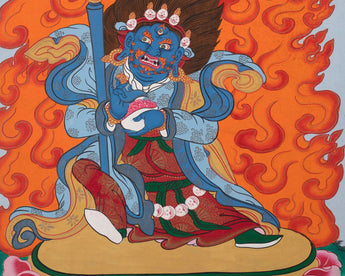 Tantric Deity Mahakala is a protector of spiritual teachings. He also removes obstacles to the teachings, so he is strong and unwavering, massive and grounded – no one can get past this fierce force. He stands here in a warrior pose, clasping a vajra, a symbol of the body's energy channels, with his other hand raised in a threatening gesture. He represents the power of all the Buddhas of the past, present, and future. Statues of Vajrapani are placed at the entrance to monasteries and temples to ward off people who would harm the teachings of the sangha, or temple.
