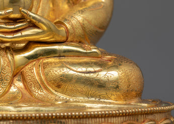 The Amitabha Buddha of Eternal Life sculpture depicts the Buddha of Infinite Light and Eternal Life, who embodies boundless compassion and the promise of rebirth in the Pure Land to those who call upon him. Standing 15.2"/38.5cm tall with a base width of 10.2"/26cm and weighing 5.72 kg, this sculpture is exquisitely made with 24K gold gilding, complemented with gold and acrylic paintings on a copper body, showing meticulous detailing and serene expressions.