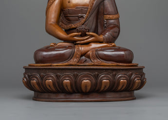 This sculpture's body, which is expertly sculpted from oxidized copper, has a rich, deep texture that accentuates Amitabha's tranquil grace and dignified position. The statue gains a timeless character from the oxidation process, which also highlights the Buddha's serene countenance and beautiful robe workmanship.