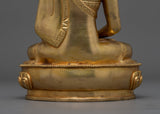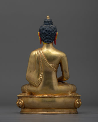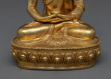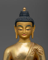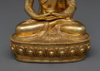 This handmade figure honors Amitabha Buddha, the Great Saviour, for his infinite compassion and knowledge. This statue, measuring 8.5" (Height) x 5.9" (Base) and weighing 1.80 kg, is made of copper, gilded with 24K gold, and embellished with gold and acrylic paints. This figurine, created by talented Nepalese artisans, captures the artistry and spiritual depth of Himalayan traditions, making it an ideal centerpiece for altars, meditation areas, or home decor.
