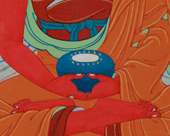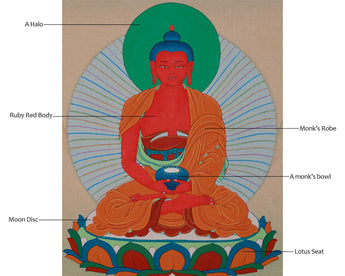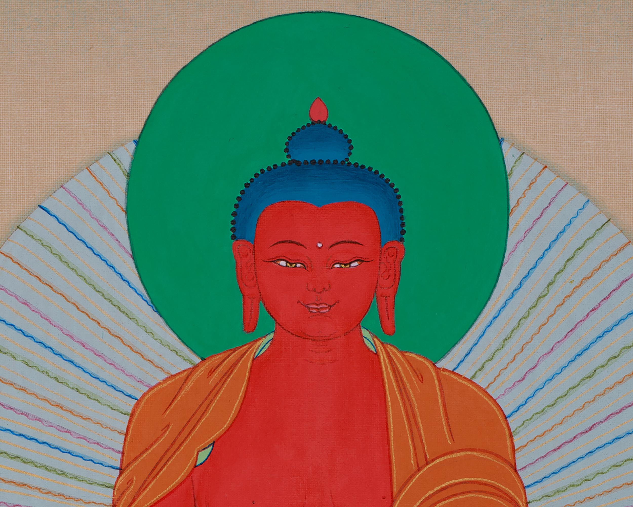 In this thangka, Amitabha Buddha is portrayed with a radiant ruby red body, symbolizing boundless love and compassion. Seated in a meditative posture on a lotus seat, he exudes tranquil energy. His monk’s robe signifies renunciation and simplicity, while he holds a monk's bowl, a mark of detachment and the power of offering. A glowing green halo surrounds his serene face, amplifying his enlightened nature. It is not just a visual treasure but also a powerful connection to Amitabha's blessing of inner peace and the aspiration toward rebirth in the Pure Land.