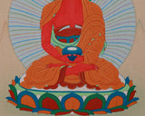Radiating the essence of boundless compassion, Amitabha Infinite Light Buddha is a symbol of spiritual awakening and enlightened presence in Mahayana Buddhism. It is associated with the Western Pure Land, Sukhavati, a realm of bliss and liberation. This thangka is hand-painted on cotton canvas using vibrant acrylic colors and 24K gold, a traditional practice rooted in the Karma Gadri style. The subtle gold accents elevate the divine aura around the figure, while the precision of acrylic layers brings depth, brilliance, and long-lasting vibrancy to this sacred depiction.