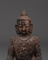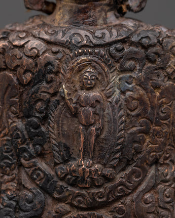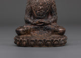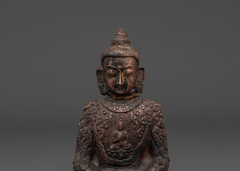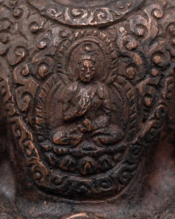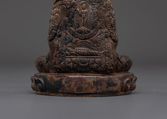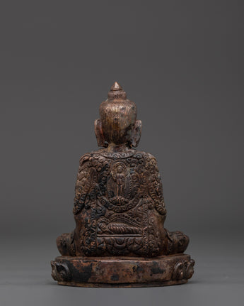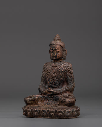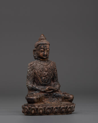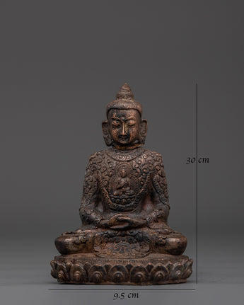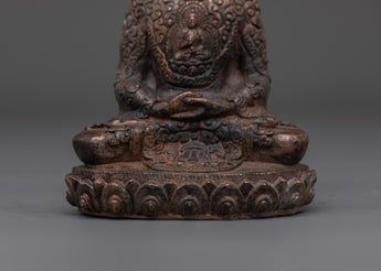 This handcrafted statue made of oxidized copper allows you to experience the tranquil presence of the Amitabha Infinite Light Buddha. This statue of Amitabha, the Buddha of Infinite Light and Compassion, stands 13 cm tall, 9.5 cm wide, and weighs 0.41 kg. It blends traditional Tibetan artistry and spiritual meaning.