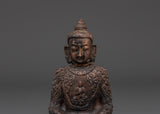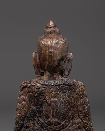 The oxidized finish reveals the statue's intricate details, including the fine engravings on the robe and the lotus base on which the Buddha sits in a meditative pose. Amitabha is venerated in Tibetan Buddhism as a source of compassion and illumination, leading practitioners to enlightenment and rebirth in the Pure Land.