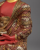 The Buddha is depicted sitting atop a moon disc lotus seat with a tranquil expression that is exquisitely mesmerizing. This statue of the Amitabha Buddha has been masterfully detailed with intricate design patterns over his Kasaya robes and the lotus flower he resides over. The deity holds an alms bowl over his lap, which contains the nectar of immortality.