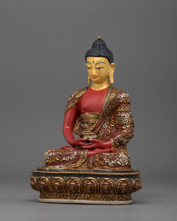 The Amitabha Pure Land Buddha monument, handcrafted in the historic city of Patan, Nepal, exemplifies the centuries-old practice of metalworking. Every detail is crafted by expert artisans whose methods have been passed down through centuries. The statue's body is formed from oxidized copper, producing a timeless appearance that matches the delicate layers of gold and silver plating.