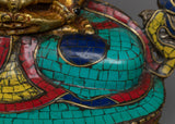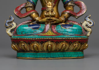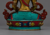 This gorgeous statue is made of high-quality copper and embellished with 24K gold gilding, giving it a dazzling shine that draws the eye and raises the spirit. The features are highlighted with gold and acrylic paintings, which provide depth and richness to the design. The antique finish gives the object a sense of timelessness, echoing ancient traditions and wisdom.