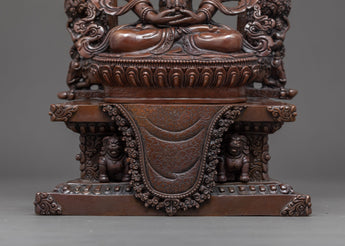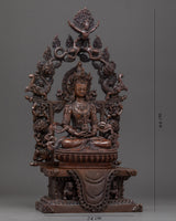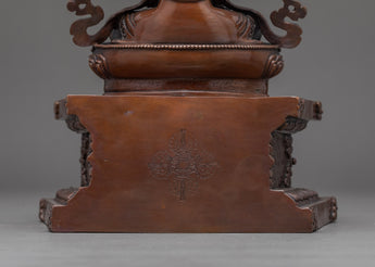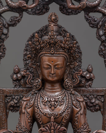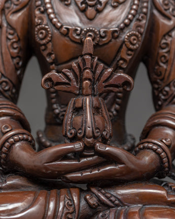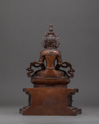 We have exquisitely hand-carved the Amitayus Bodhisattva sculpture in Nepal's traditional Himalayan art. In this statue, we have finely crafted in an oxidized copper body. We have depicted a deity seated on top of a moon disc lotus throne with a peaceful expression. It took more than a month for us to design and sculpt the statue, throne, and other essentials since we had to go into details for deft. You can use this statue on different Buddhist occasions and in regular meditational activities. We assure you that the materials used in this figurine are of high quality and will last for many years without damage or scratches.