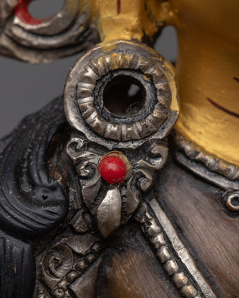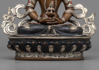 The sculpture's base is made of oxidized copper, which was chosen for its longevity and timeless beauty. The surface is then silver-plated, providing a gleaming finish that accentuates the sculpture's holy aura and depicts Amitayus' pure, infinite life energy.