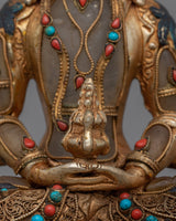 Introducing our "Amitayus Crystal Body" statue, a majestic representation of the Buddha of Infinite Life and Boundless Light. Standing 8.9 inches tall, this statue's crystal body represents clarity and eternal life. The figure is embellished with 24K gold gilding and brilliant jewels, which highlight its divine presence and detailed intricacies. Amitayus' peaceful demeanor and rich ornaments indicate his status as a deity of longevity and health.