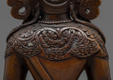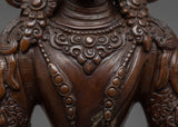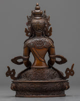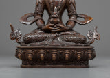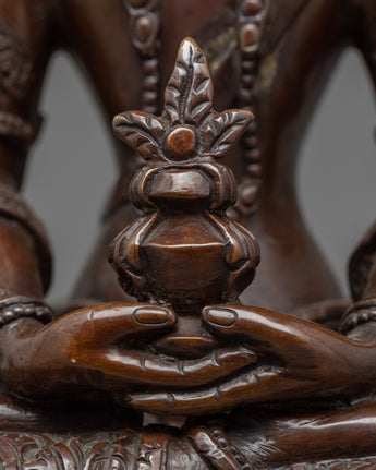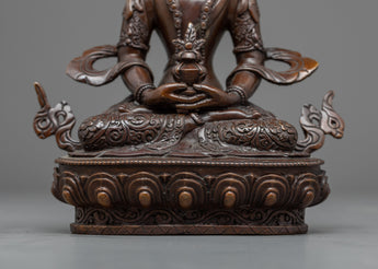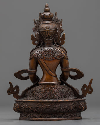 Delicately handcrafted in our workshop, the handmade buddha statue of Amitayus is intricately designed with unique Nepali motifs. The statue comprises full oxidized copper with intricate carvings done over months providing its final antique look. The Buddha is depicted sitting atop a moon disc lotus seat, holding a vase filled with 'amrita' till the brim, the nectar of immortality, with both hands.