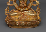 The deity is depicted seated over a moon disc lotus with a peaceful expression while he holds the sword of wisdom above his head and the book of knowledge lies in a blooming lotus. The deity is decorated with numerous body ornaments which have been embedded with precious gemstones. This hand-carved statue of the deity took our artists months of hard work to craft with a flawless design exclusively found in Nepal.