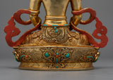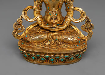 This wonderful gold-gilded Amityus Infinite Life Buddha Statue is made of copper covered with a triple layer of 24K gold gilding and carved with deeply engraved carvings that produce a magnificent 3D-like effect. This sculpture, adorned with hand-carved gemstones, represents the spiritual creativity of Himalayan Buddhism, making it a powerful addition to altars, meditation places, or sacred collections. Standing 9.8 inches (25 cm) tall with a base width of 7.3 inches (18.5 cm) and weighing 1.84 kg, the figure exudes serenity and longevity.