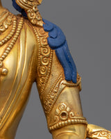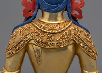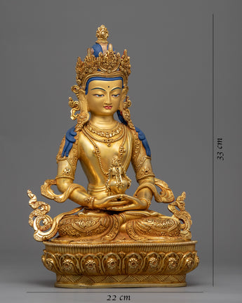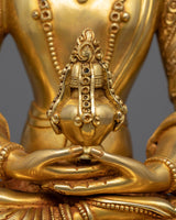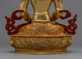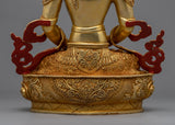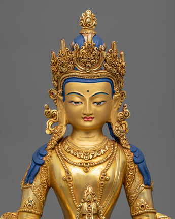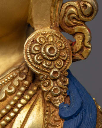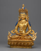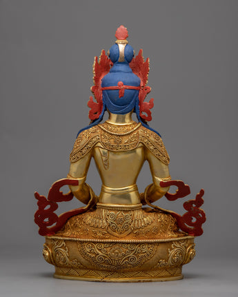 Amitayus Long Life Practice is a Tibetan Buddhist meditation practice that focuses on the deity Amitayus, also known as the Buddha of Long Life. Those who participate in the practice are said to receive blessings of longevity, good health, and spiritual prosperity. We have depicted the deity in the statue as being peaceful and tranquil, seated on a lotus seat atop a moon disc and holding a vase of amrita, the nectar of immortality, in both hands. For molding the figurine, we used copper. The utpala, various body ornaments, and crown are all custom-made with intricate design patterns.