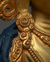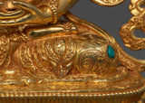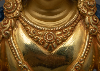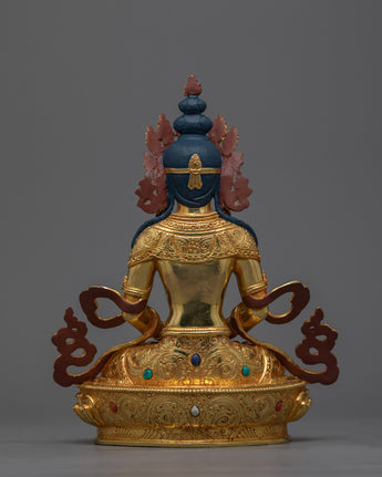 This statue, made of fine copper and gilded in 24K gold, exudes divine presence. It emanates devotion and grace as it is embellished with gold and acrylic paints and handcrafted gemstones. Weighing 1.64 kg, Amitayus' tranquil countenance and beautiful patterns make it an ideal complement to any meditation place or shrine.