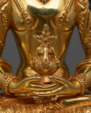 In Mahayana Buddhism, Amitayus, a manifestation of Amitabha Buddha, is honored as the "Buddha of Infinite Life." He is frequently associated with the Lotus family and represents the limitless lifetime and merit cultivation required for enlightenment. Amitayus is usually represented holding a vessel of amrita, the elixir of immortality, as a symbol of his role in encouraging longevity, healing, and spiritual endurance. His image inspires practitioners to live a mindful, compassionate, and wise life.