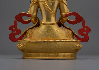 The Amitayus Longevity Sculpture is a portrayal of the Buddha of Infinite Life, carved from copper and gilded with 24K gold. The statue is 9"/23cm tall with a base width of 6.9"/17.5cm, weighs 1.48 kg, and has delicate gold and acrylic paintings that highlight its holy presence. This timeless sculpture represents the blessings of longevity, health, and prosperity, making it an ideal addition to any Buddhist altar, meditation room, or home decor.