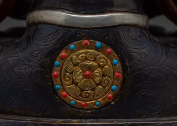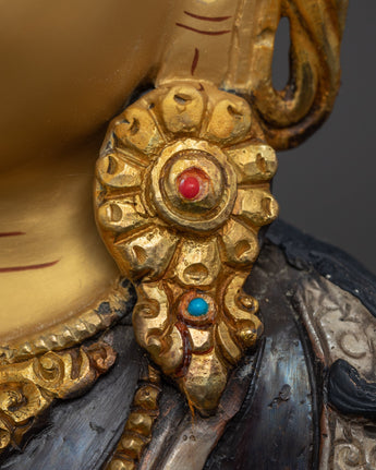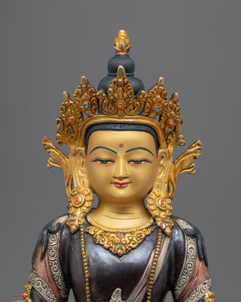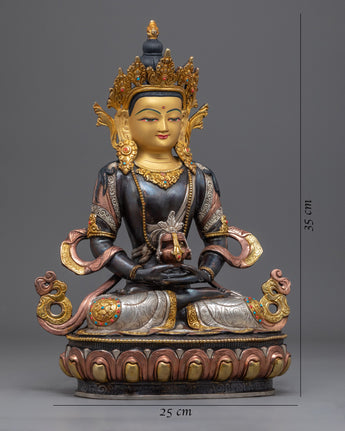 The Amitayus Mantra Practice Statue is a beautifully crafted piece made by skilled artisans from Nepal. It is made from pure copper and coated with genuine 24-karat gold. The sculpture depicts the Buddha of Infinite Light, Amitayus, who is believed to bring benefits to our lives. The statue shows Amitayus sitting in a meditational pose on a moon disc lotus with a peaceful expression and holding a vase filled with Amrita. It took over a month to complete this sculpture due to the intricate details in the robes, crown, and lotus seat.
