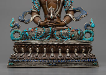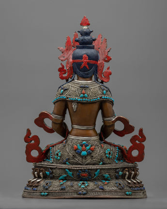 Introducing the sculpture of Amitayus with Gemstones, the Buddha of Infinite Life and Longevity. This sculpture embodies the essence of Amitayus' benefits of long life, health, and spiritual insight. It stands an astounding 13.3 inches tall on a base of 9.4 inches and weighs 3.88 kg. This item represents Amitayus' limitless compassion and life-enhancing spirit. It is crafted from an oxidized copper body for a timeless and revered appearance. It is adorned with gold and acrylic paints, enhanced by silver plating, and hand-carved jewels.