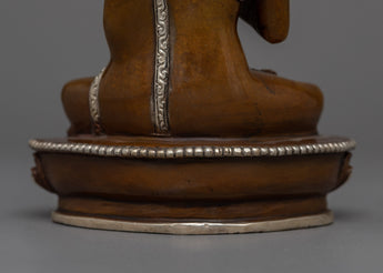 Introducing our "Amogasiddhi Oxidized" statue, a striking depiction of the Buddha of Fearlessness. Standing 5.5 inches tall and weighing 0.548 kg, this statue is expertly built from an oxidized copper body. The oxidized finish highlights the fine features of Amogasiddhi's peaceful expression, meditative stance, and the symbolic symbols he holds, which represent profound protection and bravery.