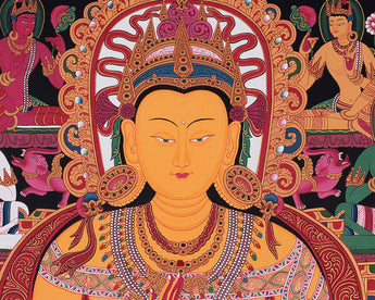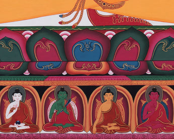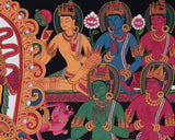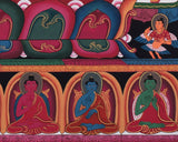 Amoghasiddhi sits in deep concentration, exuding calm strength. His right hand is in the Abhaya Mudra (a gesture of fearlessness), symbolizing protection and the removal of fear, while his left hand is in a meditative balance. He wears a jeweled crown and celestial ornaments, symbolizing spiritual authority and energy. The background features glowing attendants and Bodhisattvas, symbolizing the northern Pure Land, where Amoghasiddhi resides. Other Buddhas and enlightened beings surround him, enhancing the thangka's completeness. This thangka is a beautiful prosperity and a spiritual gateway for unleashing compassion and transforming energy.