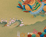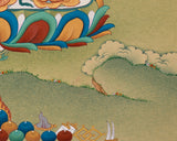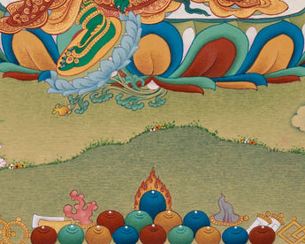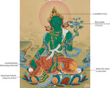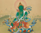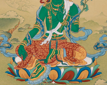 Anika Goddess Tara (Green Tara) is a potent representation of compassion, speed, and heavenly protection. In this Thangka, she is seated gracefully on a lotus seat, her posture indicating her readiness to attend to the needs of all sentient beings. Her right hand, extended in the Varada Mudra, represents generosity, while her left hand holds a blossoming lotus, which represents purity and spiritual awakening. Above her, Amitabha Buddha presides, representing wisdom and enlightenment and stressing Tara's enlightened heritage.