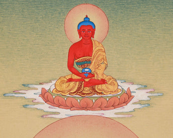 Embrace the pleasant presence of Anika Goddess Tara, exquisitely portrayed with Amitabha Buddha in this minimal but finely drawn Thangka. Painted on high-quality canvas, this exquisite artwork is brought alive with vibrant Lhasa stone colors, which lend depth and authenticity to the composition. Real 24K gold accents highlight the piece's exquisite features and heavenly forms with an ethereal radiance. This small artwork seamlessly blends artistic skill with spiritual devotion, created in the traditional Karma Gadri style, celebrated for its harmonious simplicity and spiritual elegance.