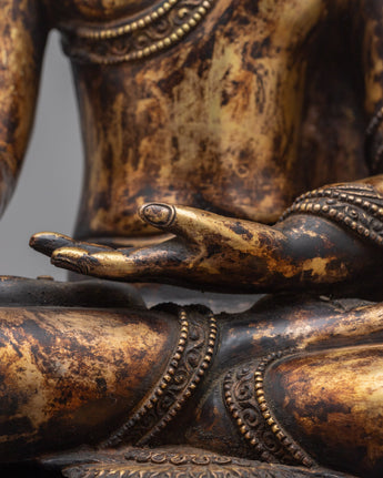 The Antique Crown Shakyamuni Buddha Statue is a representation of eternal knowledge and calm. Let it envelop you. This amazing statue, which is 25.4 inches tall and weighs 16.77 kg, was carefully created with great attention to detail. Its profound presence inspires awe. This statue exudes a sense of calm and divine grace. It is made of 24K gold-gilded copper with an antique finish. It is adorned with delicate craftsmanship and intricate detailing. Every feature of this sculpture captures the infinite wisdom of the Enlightened One, from the serene expression on Shakyamuni Buddha's face to the flowing robes that represent his compassion. After you place it in your sacred area, allow its calm energy to lead you toward enlightenment and inner serenity.