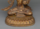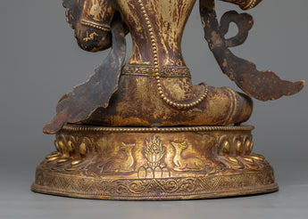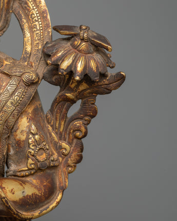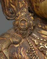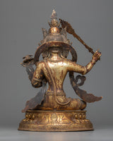 This sculpture is made of copper and has an antique finish that provides a feeling of eternal knowledge and depth to the item. The bright 24K gold gilding complements this antique charm, revealing Manjushri's delicate yet profound presence. The statue's size and weight make it an eye-catching addition to meditation areas and study areas or as a focal point in a room dedicated to contemplation and learning.