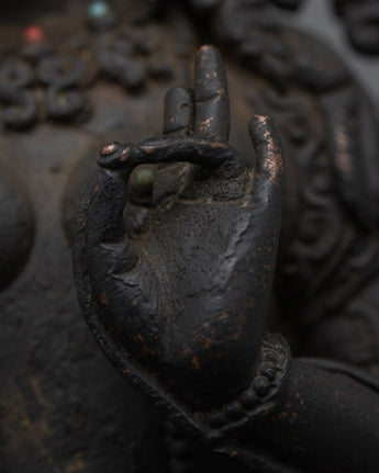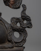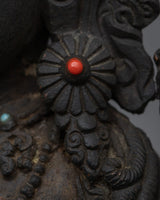 The antique-looking Green Tara, a symbol of compassion and relief, is presented. With a height of 8.2" and a base of 5.7", this statue adds a touch of spirituality and aesthetic refinement to any room. This statue is meticulously created by Nepali artisans who use time-honored techniques to make this one-of-a-kind sculpture. The statue's core is an oxidized copper body, which gives it a genuine, antique finish that speaks of years of wisdom and spiritual dedication.