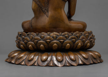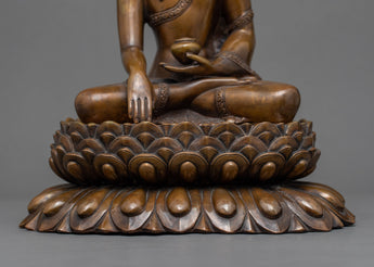 We are a team of artisans that meticulously hand-carved the antique buddha-statue-design in the style of the Himalayas. For more than decades, we have been carving Buddhist holy deities, adhering to Buddhist iconography. This figurine of Gautama depicts him sitting on the moon disc of a lotus seat with a serene look at Buddha at the time of his enlightenment. His left hand is holding an alms bowl, while his right hand is making the mudra earth-touching. The molding of the figurine using oxidized copper gives the statue an antique appearance.