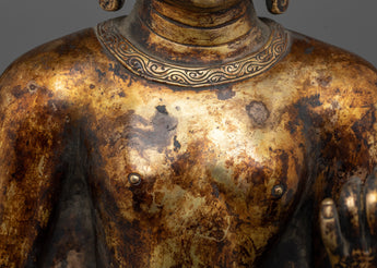 The Antique Standing Shakyamuni Buddha Statue can help you achieve spiritual enlightenment. This amazing sculpture, which stands 15.7 inches tall and weighs 7.25 kg, represents the height of spiritual development and inner serenity. It has an antique finish and is made of 24K gold-gilded copper, giving it a transcendental and enlightening air. This sculpture bears witness to the deep teachings of Shakyamuni Buddha in every detail. Every aspect of the Enlightened One's body, from his calm expression to the elaborate decorations, embodies the ageless compassion and knowledge. Put it on display in your hallowed space and let its presence take your spiritual practice to new levels.