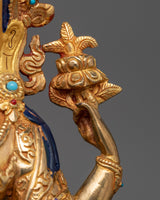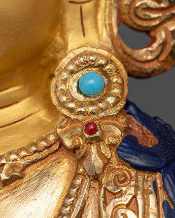 This Arya Avalokiteshvara Figurine, which was created by skilled craftspeople in Patan, Nepal, demonstrates great devotion and workmanship made of copper, it is embellished with 24K gold gilding and enhanced with acrylic and gold paintings, adding to its heavenly charm. The devotion of Nepalese craftsmen is reflected in the fine design on the deity's flowing garments and lotus base. Its small size makes it perfect for altars, meditation areas, or as a heartfelt spiritual gift.