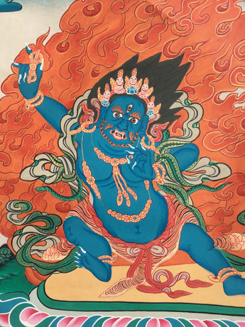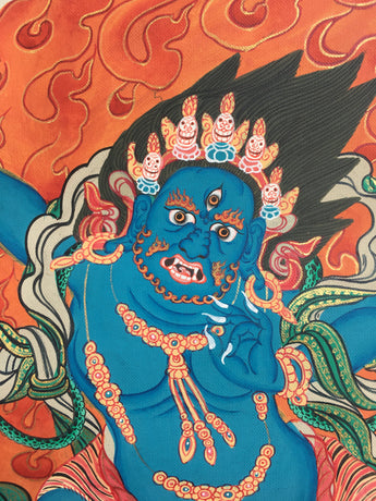Vajrapani is the embodiment of The Buddha's infinite power and is always represented in wrathful form. He is shown here in a standing position. He wears a tiger skin, wrapped around his waist symbolizing fearlessness and his hands display the threatening mudran or in other words, his hands are in a threatening posture. He holds a vajra or the symbol of indestructibility in his right hand and is adorned with a garland of snakes, the embodiment of anger, which he transforms, by the force of his great compassion. He has a third eye of wisdom in the center of his forehead and wears a crown of five skulls symbolizing his mastery of the five wisdom of Buddhas and a vajra is embedded on its topknot symbolizing his affiliation with the Vajrayana lineage.