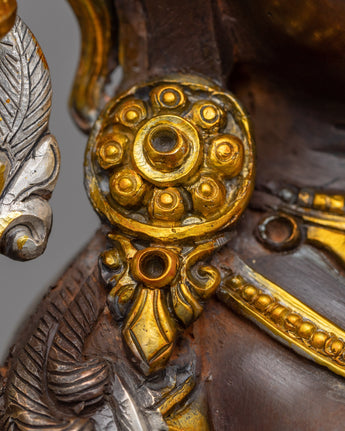 The figurine, skillfully carved from oxidized copper, emits an antique appeal that is complemented by the richness of gold and acrylic paintings. The oxidation process imparts an aged, venerable appearance to the statue, emphasizing the details of Green Tara's tranquil expression and the elegant folds of her clothes.