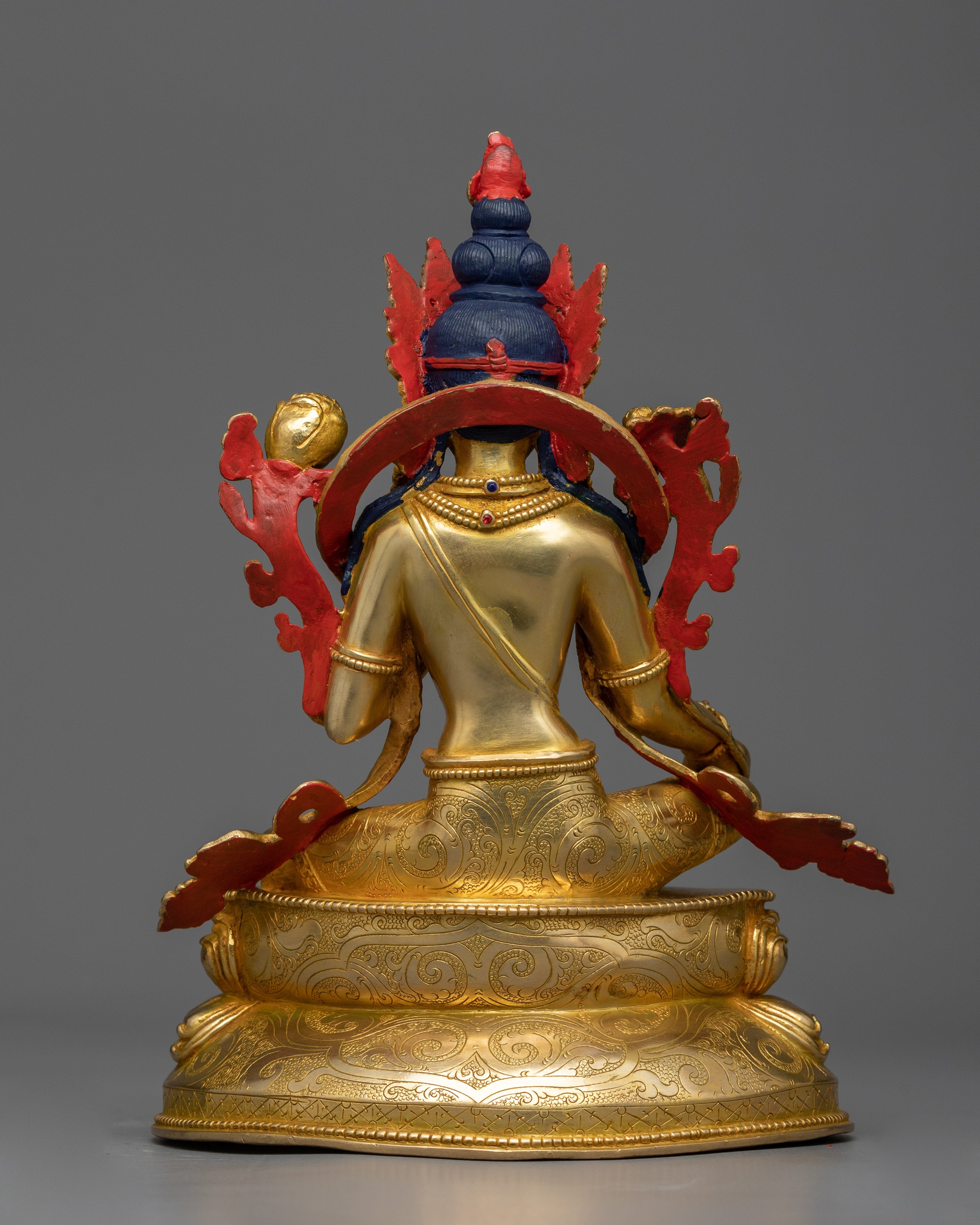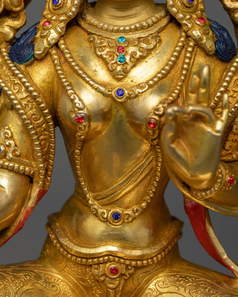 With one leg outstretched, ready to answer anyone who cries for help, Green Tara is portrayed in her well-known stance, signifying her dedication to prompt assistance. The 24K gold gilding enhances her divine presence, illuminating her figure against the backdrop of any space. At the same time, the intricate details and vibrant colors of the acrylic paintings highlight her compassionate gaze and the symbolic gestures that signify her role as a protector.
